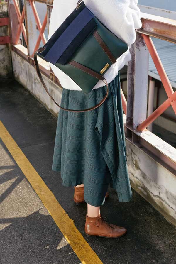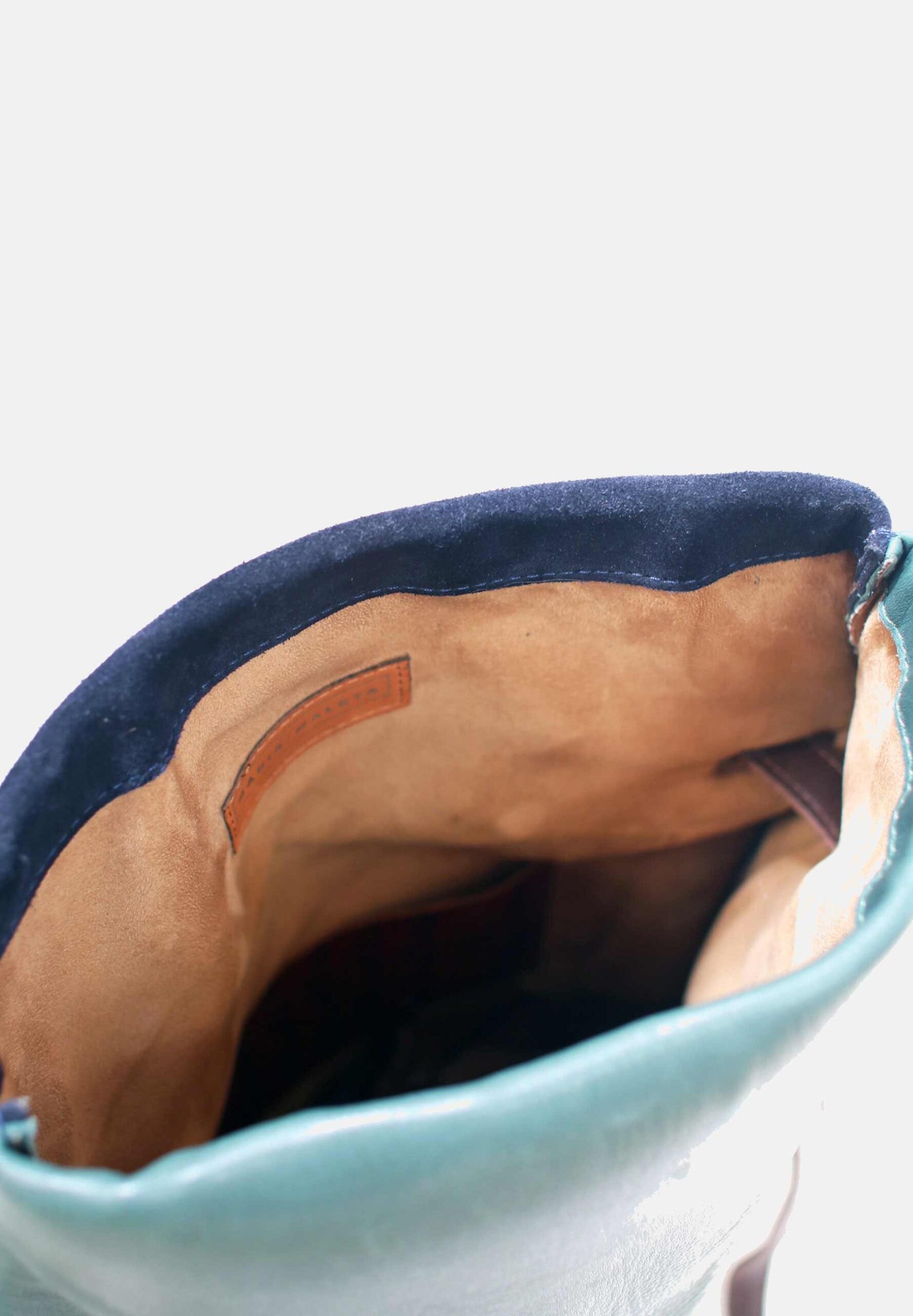 Laptop backpack in leather. Blue navy suede and dark green leather. Upcycled blue elastic from the waste of polyester and cotton. and adjustable straps  70cm – 80cm. Two inner pockets. Dimensions:  35 x 33 cm. With an extra handle strap. REF. MMBMOSS Made in Portugal