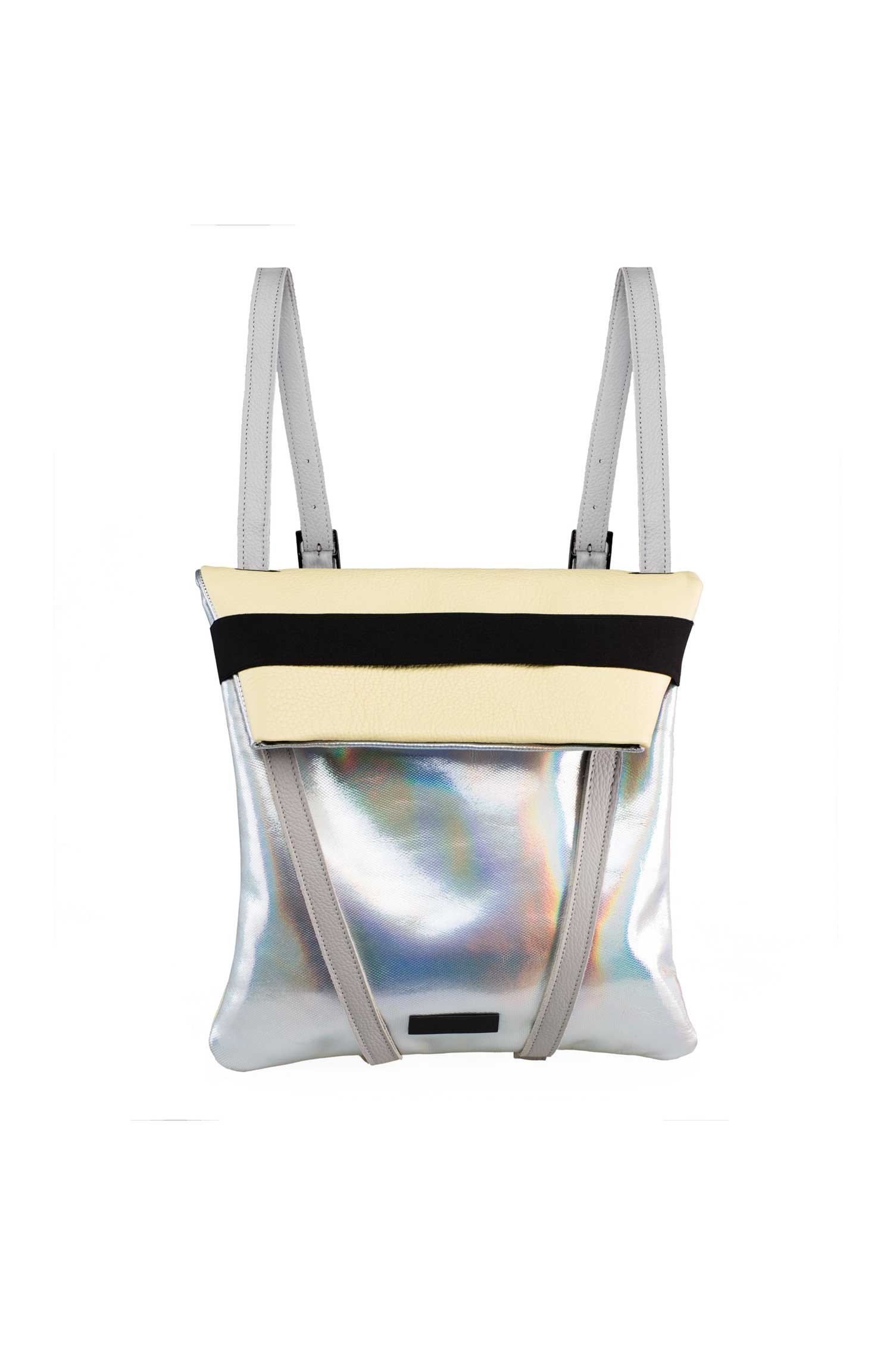 Backpack laptop in leather. Light yellow in one side. Back silvery holographic leather. Upcycled black elastic from the waste of polyester and cotton. and adjustable straps 70cm – 80cm. Two inner pockets. Dimensions:  35 x 33 cm. With an extra handle strap. REF. MMBPR2 Made in Portugal